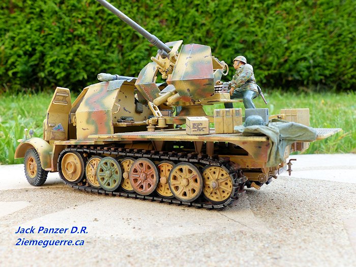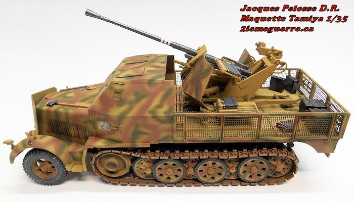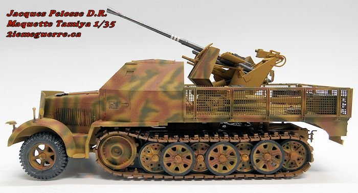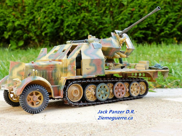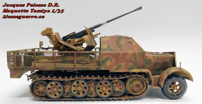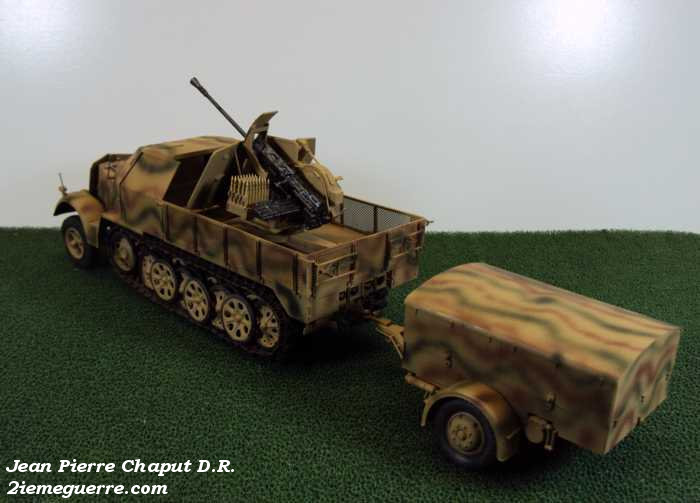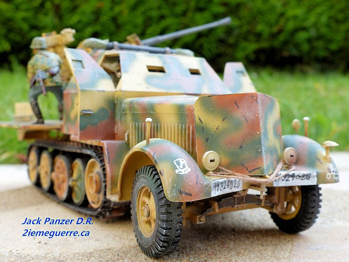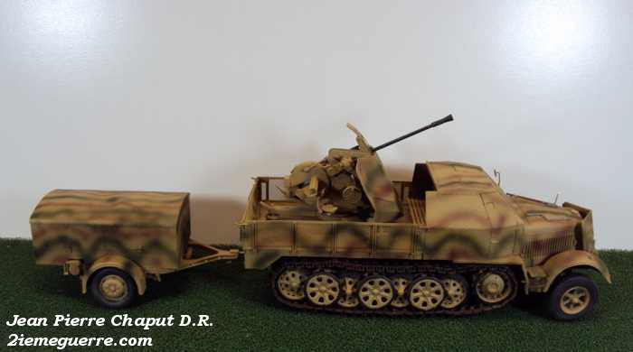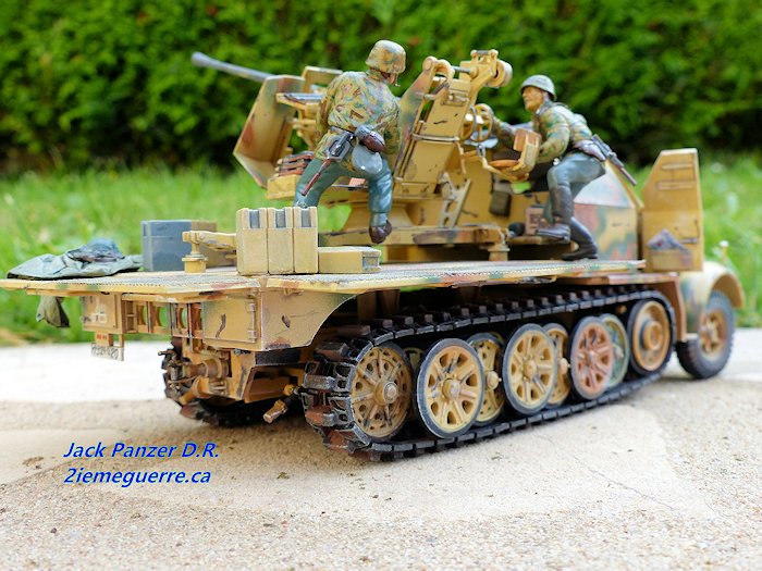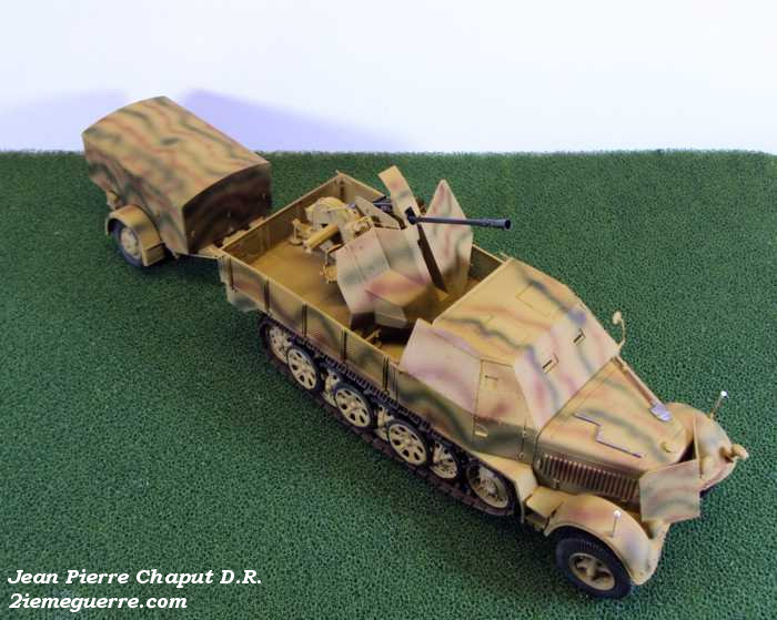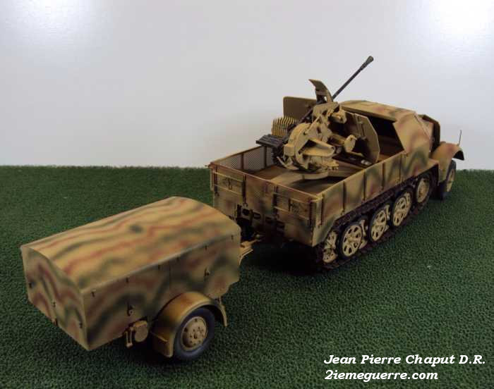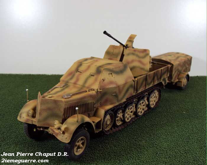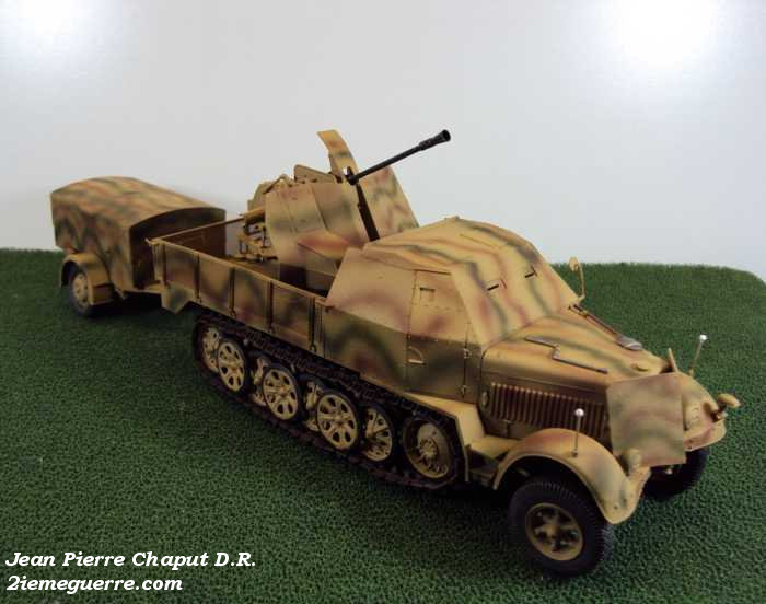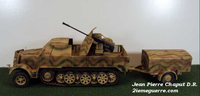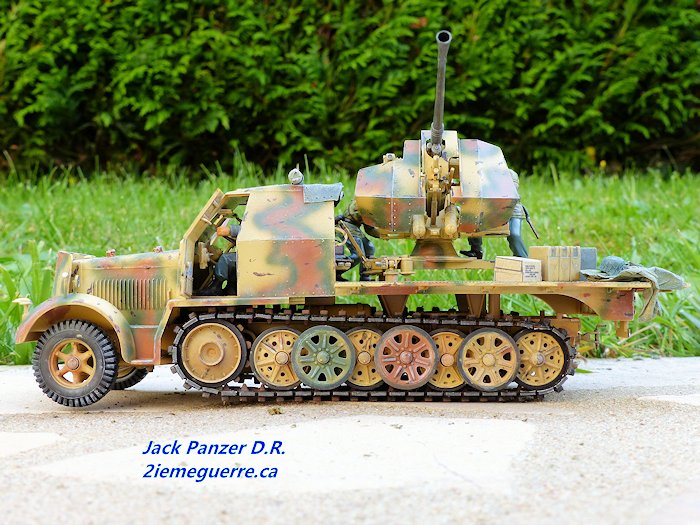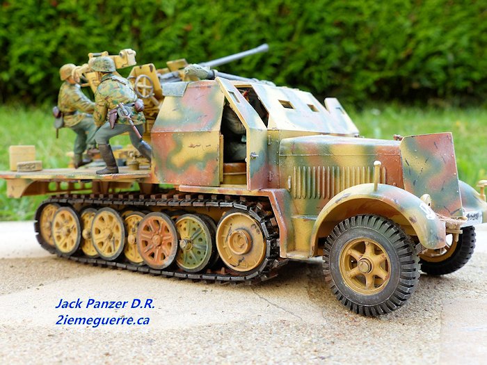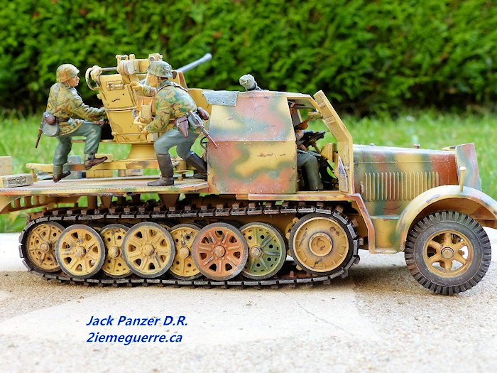 | La logistique et la mobilité sont des facteurs décisifs dans un conflit et la 2e G.M. en a été l'exemple type. L'Allemagne réalisa très tôt l'importance des véhicules de soutien et les employa intensivement lors de ses avancés éclairs " Blitzkrieg " au début des hostilités. Parmi les véhicules produits, le Sd.kfz 7, tracteur semi-chenillé fut sûrement le plus réussi. Cet engin de 8 tonnes était principalement utilisé par les unités d'artillerie pour tracter le célèbre canon antiaérien de 88mm. et le canon lourd de campagne de 150mm. Conçu par la firme Krauss-Maffei, il est construit sur un châssis de camion conventionnel modifié. La suspension avant est constituée de ressorts à lamelles. À l'arrière, des ressorts à lamelles et barres de torsion sont reliées au train de roulement compact typique aux véhicules militaires allemands de l'époque.Le moteur Maybach délivrait 140 chevaux assurant une vitesse de pointe de l'ordre de 5o km/h. Différentes versions furent produites incluant des ensembles de DCA autotractées montant les canons de 20 ou 37mm. et un poste de lancement pour les fusées v2 à la fin du conflit. De par sa polyvalence et sa fiabilité, ce half-track de 8 tonnes est considéré comme une réussite dans le domaine de la conception de véhicules militaire. Ce véhicule fut sans aucun doute le véhicule semi-chenillé le plus utilisé de la guerre par l'armée allemande. L'armée tchèque les utilisa jusque dans les années 1960 ! |